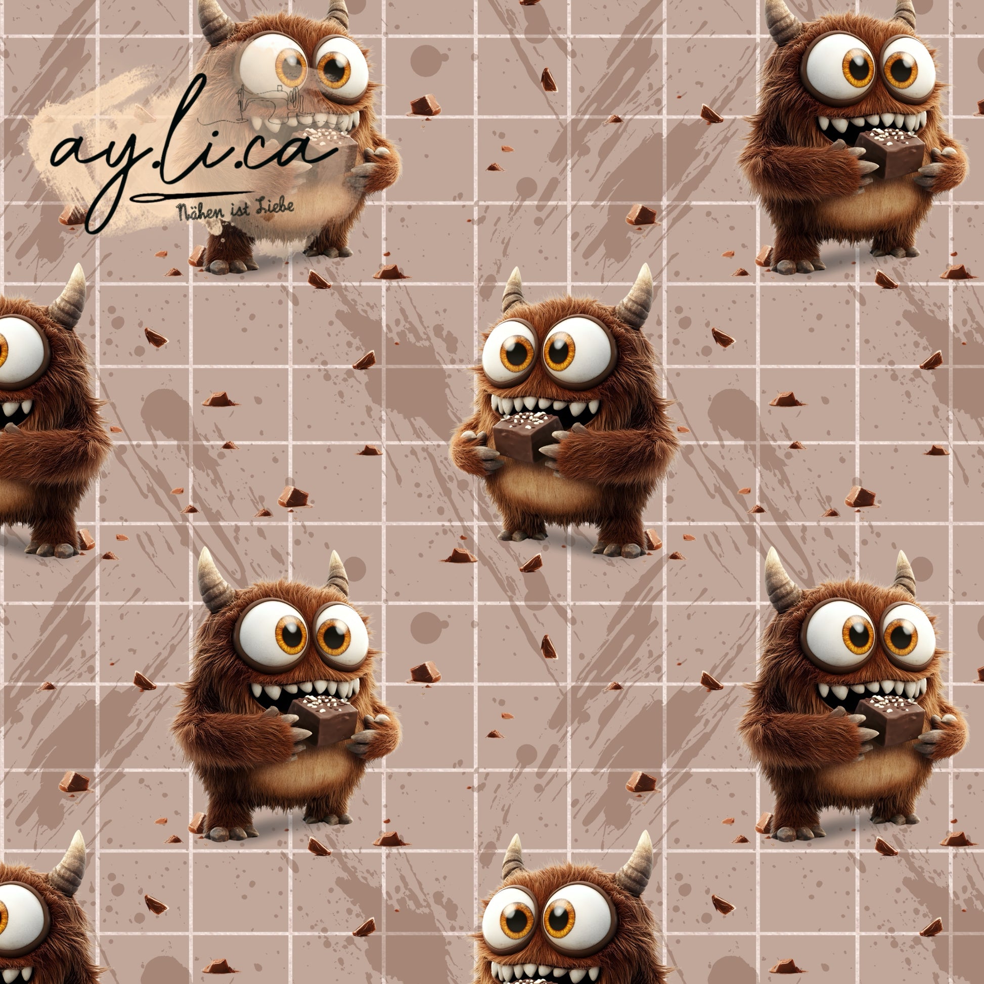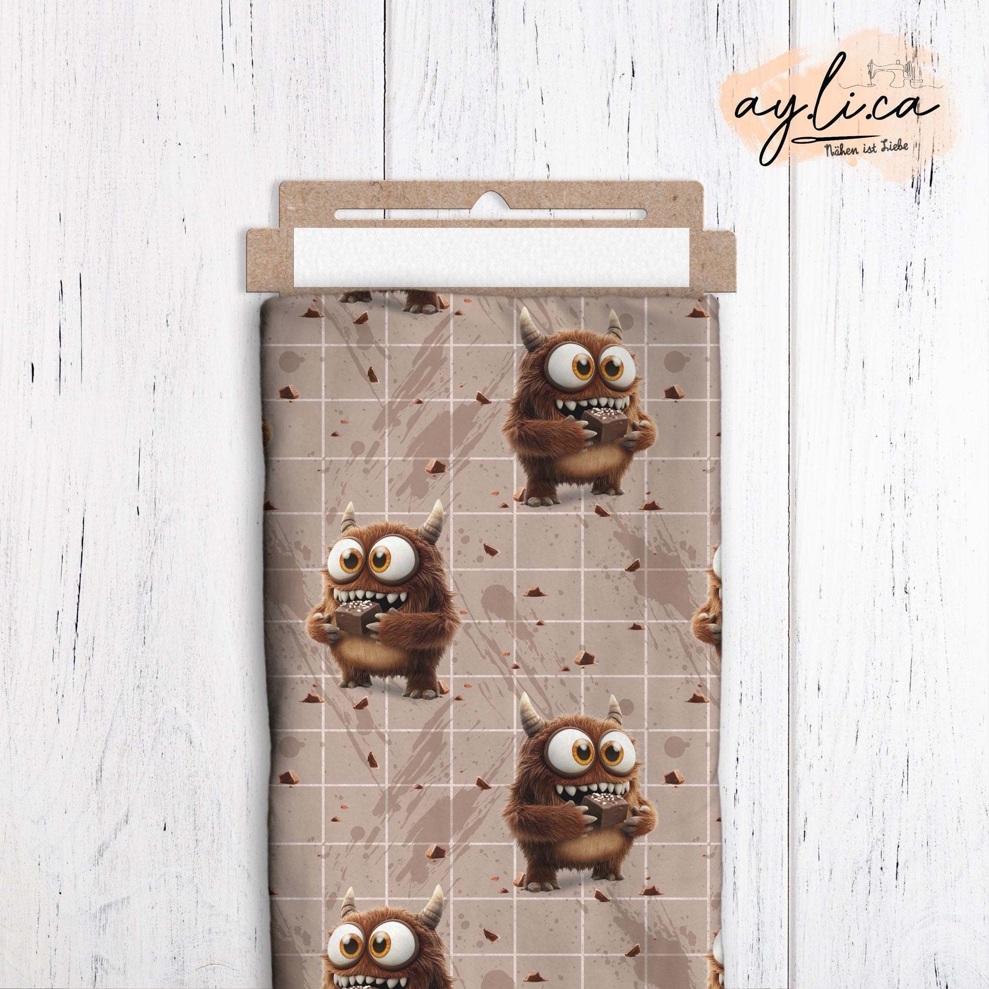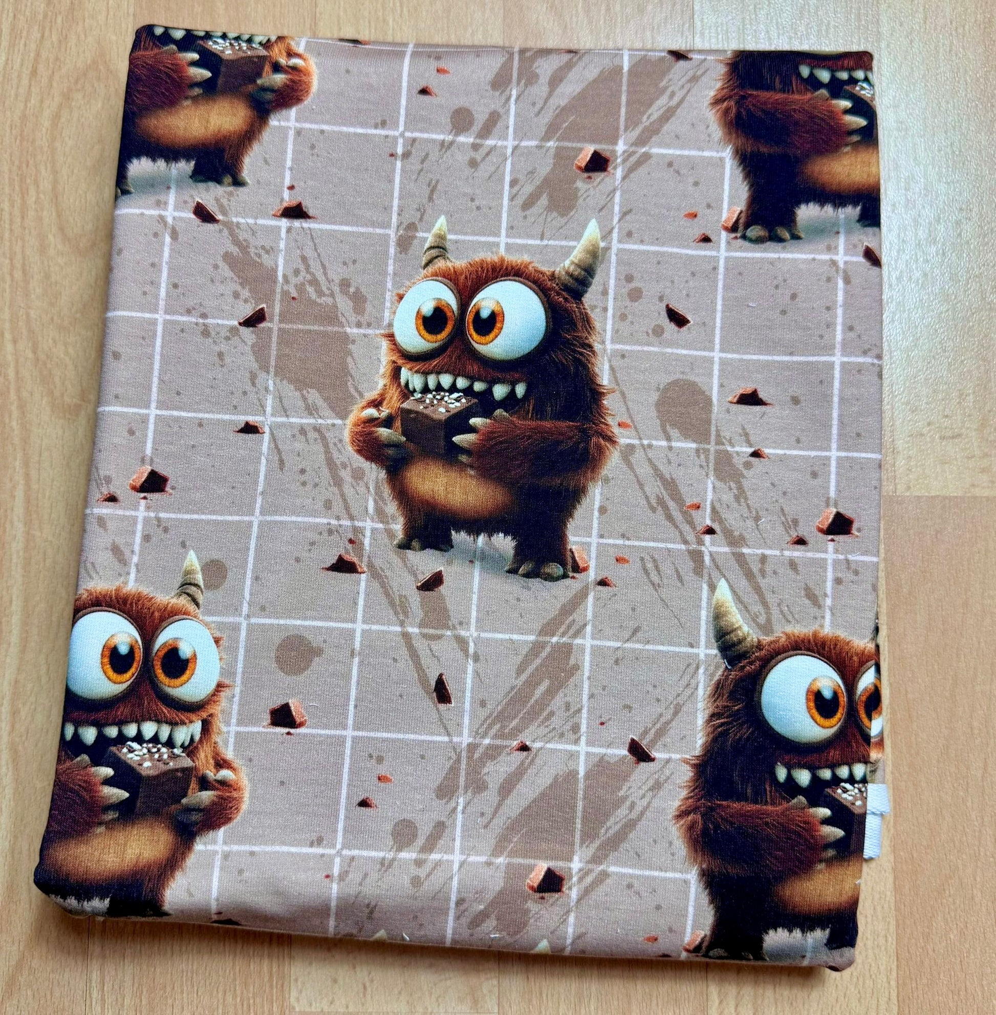 ultracooles Design mit niedlichem Schokomonster auf ökozertifiziertem French Terry in Überbreite d.h. die volle Breite des Stoffes beträgt stolze 180cm.